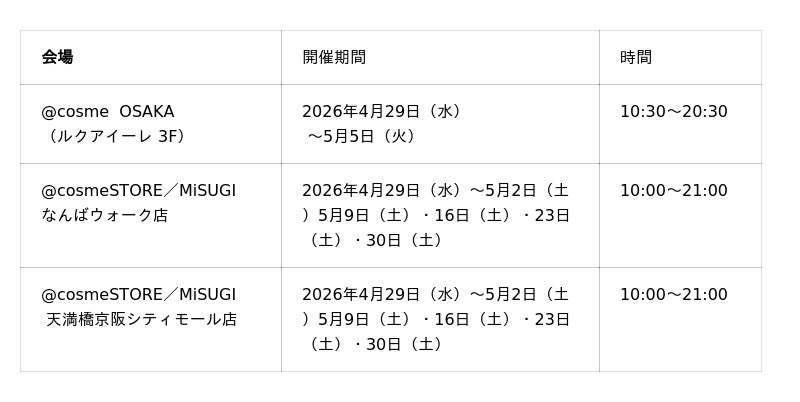 ※こちらの画像に記載の期間は「@cosme OSAKA」の日程となっております。「@cosmeSTORE/MiSUGI天満橋京阪シティモール店」「@cosmeSTORE/MiSUGI天満橋京阪シティモール店」に関しましては、上記【各ポップアップ開催概要】をご覧くださいませ。