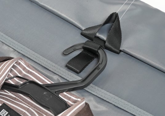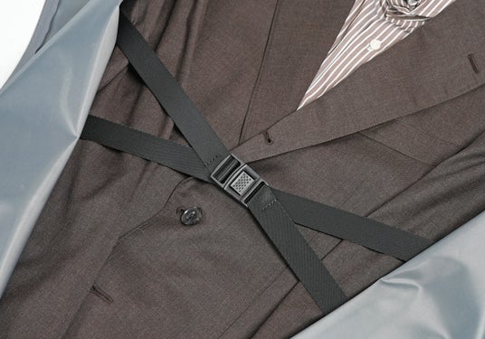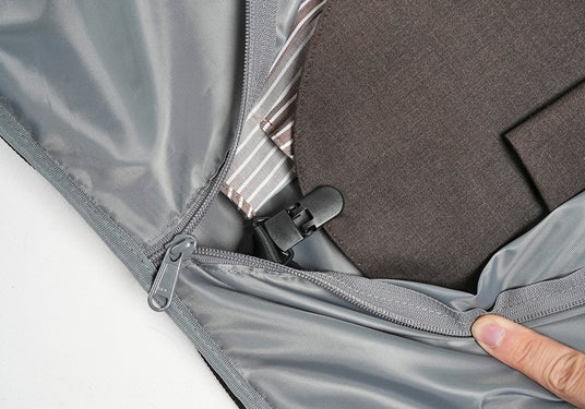 スーツの収納内部には「スーツ固定・吊り下げベルト」「中間止めベルト」「裾止めクリップ」の3点を装備。バッグの中でスーツがよれたり、ずれる事を防ぎ、移動中も美しいシルエットを保持します。ネクタイを収納する専用ポケットも完備されており、他の荷物に埋もれずシワなく持ち運べます。