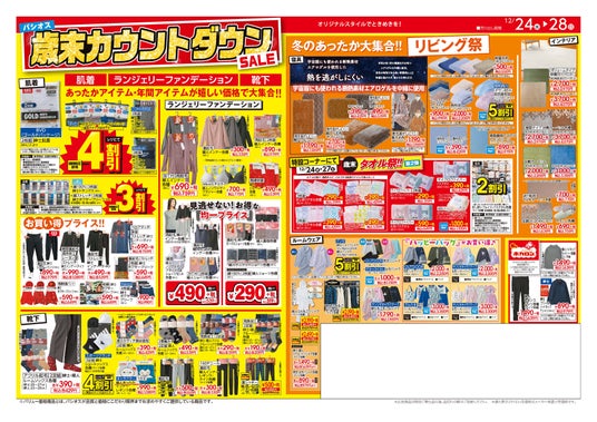 株式会社田原屋(本社所在地:神奈川県川崎市、代表取締役会長:田熊 太郎、代表取締役社長:甲斐 直裕)は、12/24(水)よりファッションプラザ[パシオス(https://www.paseos.co.jp/)]で【歳末カウントダウンSALE】を開催いたします。