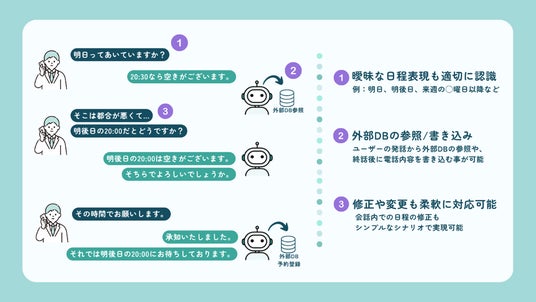 予約システムおよび顧客管理システムとAI Messenger Voicebotが自動連携することで、電話口でのリアルタイムな新規予約等の応対を実現しました。また、本取り組みで活用するリニューアルされたAI Messenger Voicebotは日程調整や予約の詳細情報など、これまで複数回のやり取りが必要だった電話応対がスムーズかつ効率的に完結できるようになりました。