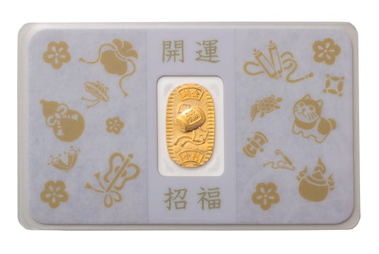 中央に配した純金1gの小判には、縁起物とされる「打ち出の小槌」を、その両側の台紙には縁起が良いとされる様々なモチーフと宝物を集めた吉祥文様「宝尽くし」を施しました。