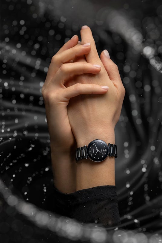 まず、ポリッシュ仕上げのブラックハイテクセラミックとポリッシュ仕上げのステンレススチール装飾を組み合わせたブラックとシルバーのモデルは、ロジウムカラーの針が映えるクラシックで洗練された印象です。