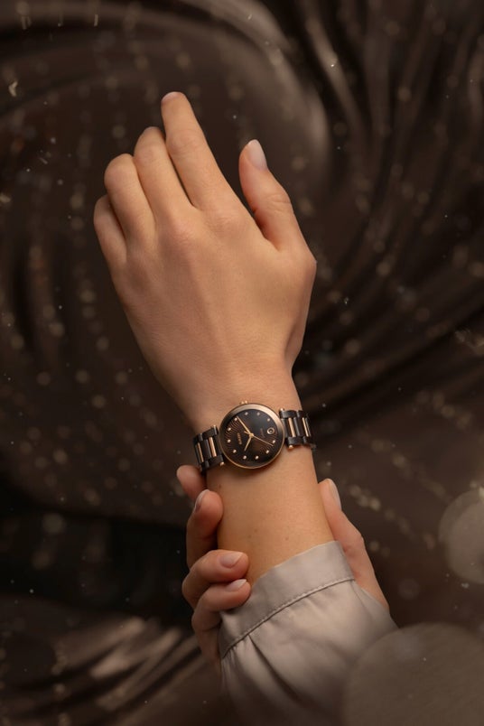 鮮やかなブラウンにローズゴールドのメタライゼーションを施したポリッシュ仕上げのブラウンハイテクセラミックタイプは温かみのあるエレガントな表情を見せ、輝くようなホワイトにローズゴールドのメタライゼーションが施されたポリッシュ仕上げのホワイトハイテクセラミックモデルは、洗練された華やかさが際立ちます。