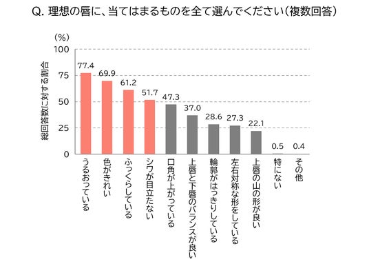 これまでのアンケート調査の結果(図1)から、理想の唇について、「うるおっている」、「色がきれい」、「ふっくらしている」、「シワが目立たない」の4つの要素が特に重要であると考えられました。この結果を参考に、魅力的に感じる唇の外見の要素として「うるおい」、「色み」、「ボリューム」、「シワ」の4つに着目しました。