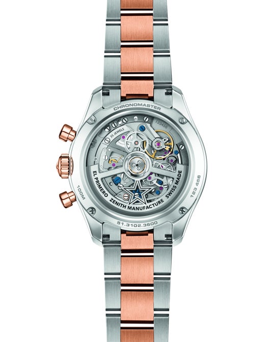 サファイアガラスのケースバックからは、コラムホイールと水平クラッチ構造を備えたムーブメンと、ゼニススターが刻まれたオープンワークのローターを眺めることができます。両方向巻き上げ機構は約60時間のパワーリザーブを実現し、この時計を特徴づけるリズムを安定して保ちます。