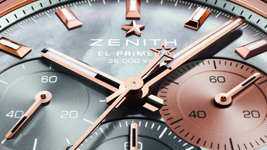 サファイアガラス越しにさりげなく光沢を湛えるマザーオブパールの文字盤は、入念な計算のもと、華美な装飾感が抑えられています。光は文字盤の表面全体を行き来し、時間帯によって印象を少しずつ変化させます。オリジナルのエル・プリメロの系譜に連なる、3時・6時・9時位置の重なり合う象徴的なカウンターはそのままに、ファセットカットを施した針とアプライドインデックスがどのような環境下で