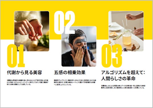 美しさはもともと、香り・質感・色のきらめきなど五感に訴える体験と深く関わってきました。ローションの香り、クリームのなめらかさ、コスメの輝き――それらはこれまで副次的なの要素として扱われてきましたが、今では美容品から「どのような体験を得られるか」こそが重視される時代になっています。つまり、感覚を刺激すること自体が、商品を購入する大きな理由になっているのです。心の健康(メンタルウェルビーイング)への関心が高まる今、2026年は「美容の感覚的進化」に本格的に乗り出す絶好の年になるでしょう。香りで気分を整える機能性フレグランスや、神経科学の応用、VRなどの没入型テクノロジーといった新しい発想が、日々の美容習慣をより豊かで五感に響く体験へと変えていくと考えられます。