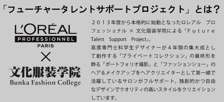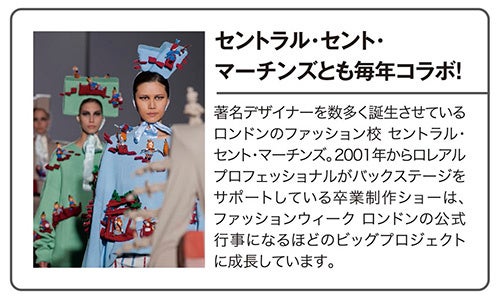 世界年間売上1位を誇る一大ビューティー企業であるロレアルグループ。その中核を担うヘアブランド「ロレアル プロフェッショナル」では、若きクリエイターの育成を目的にイギリスの「セントラル・セント・マーチンズ」など有名ファッションスクールの卒業ファッションショーや若手デザイナーのコレクションのhair&make-up Creationのバックステージサポート企画「Future Talent Support PROJECT」を推進しています。