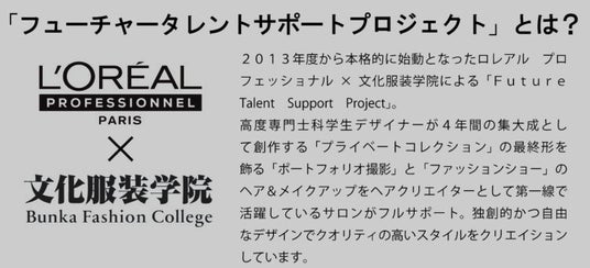 ロレアルプロフェッショナルによる若手デザイナーサポートプロジェクト。日本では文化服装学院が13年連続支援対象に。12名の学生デザイナーとヘアサロンによるファッションとヘアが融合したショーステージを披露