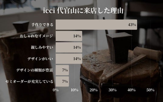来店理由として「手作りできる」(43%)が圧倒的なトップとなり、icci代官山の体験型サービスがお客様にとって最大の魅力であり、主要な来店動機となっていることが明確に示されました。お客様が単なる製品購入ではなく、指輪作りのプロセスや思い出づくりに高い価値を見出していることがわかります。