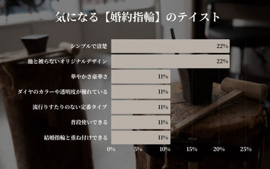 婚約指輪のテイストに関する結果は、「シンプルで清楚」(22%)と「他と被らないオリジナルデザイン」(22%)が同率で最多となり、二極化の傾向が非常に強く表れました。