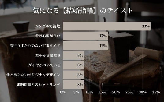 結婚指輪のテイストでは、「シンプルで清楚」(33%)が圧倒的な首位となり、長く身に着けるものとしての普遍的で飽きのこないデザインが最も重視されていることがわかります。