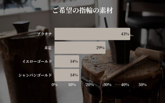 指輪の素材に関する回答では、「プラチナ」(43%)が最多となり、ブライダルジュエリーの定番素材としての根強い人気を再確認できます。特別な節目にふさわしい耐久性と高級感を重視する傾向が読み取れます。