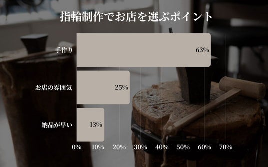 指輪制作でお店を選ぶ際に最も重視されるポイントとして、「手作り」(63%)が圧倒的多数を占めており、お客様がicci代官山に手づくり体験そのものを強く求めていることが明確に示されました。この結果は、icci代官山が提供する「思い出を形にする」という体験価値が、他店のサービスと一線を画す最大の魅力であることを裏付けています。