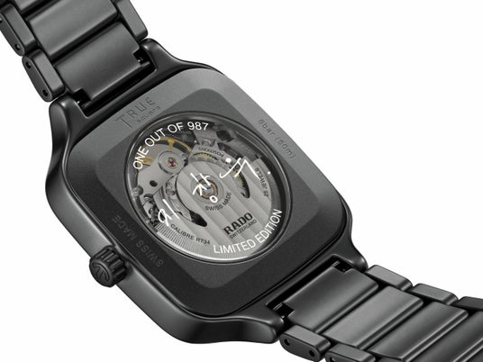 ムーブメントにはラドー キャリバーR734を搭載。25石の自動巻き3針ムーブメントは5ポジションで