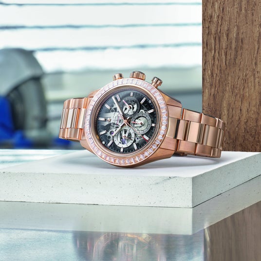 そしてコレクションを締めくくるのは、ローズゴールド製ケースにゴールドブレスレットを備え、ベゼルに50ピースのバゲットカットのダイヤモンドをセットした限定生産10本のモデルです。