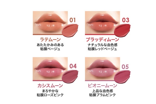 新1色が加わり全5色のカラーラインナップへ。リアルな血色感カラーと粘膜のようなツヤを与える