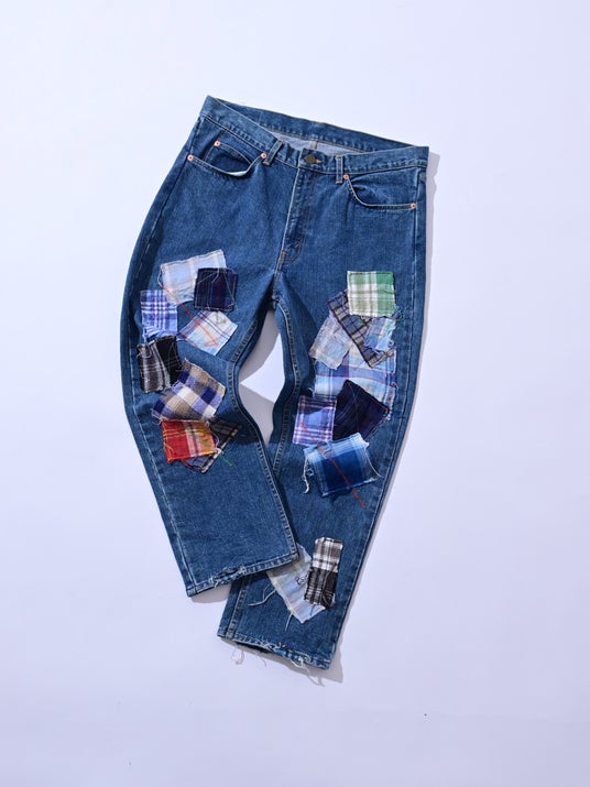 残布やUSED生地をランダムにパッチワークした、表情豊かなREMAKEデニムジーンズ。