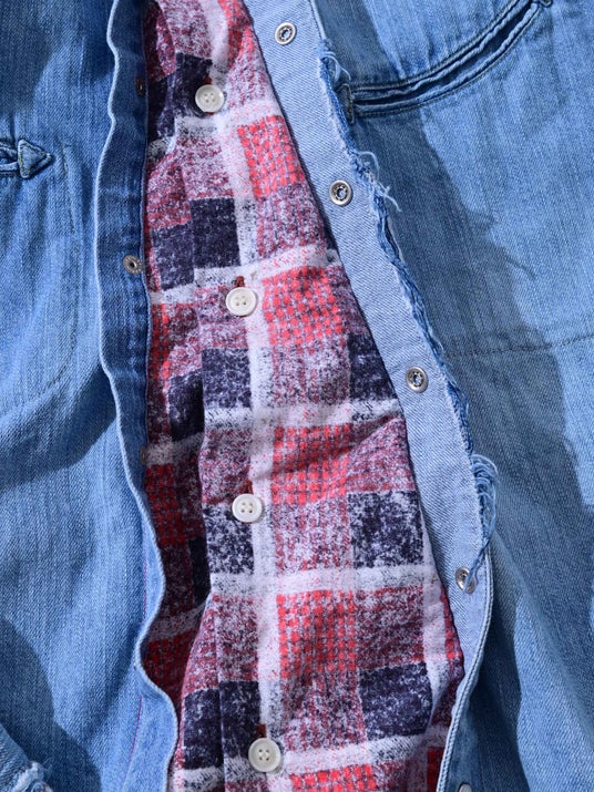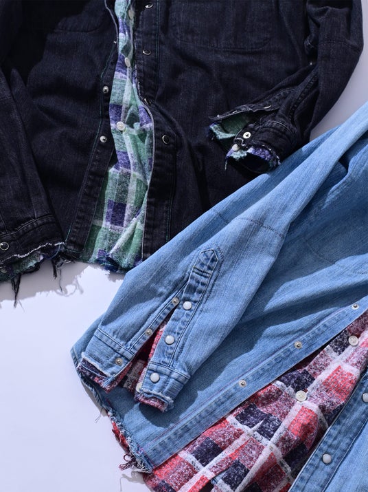 ネルシャツを重ね着しているように見える、存在感のあるレイヤードREMAKE シャツ。ウエスタンシャツをベースに、異素材を組み合わせた構造が、一枚でスタイルを完成させます。