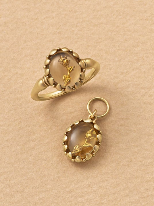 透明感が美しいシトリンに繊細なバラのモチーフが浮かんでいるような、奥行きのあるデザイン。
