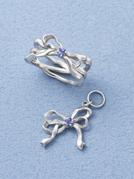 存在感のある太さにタンザナイトを添えた洒落感たっぷりなピンキーリングと、ほどよい今っぽさをプラスできるチャームはセットで合わせるのがおすすめ!