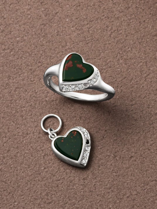 世界最古のモチーフであるハートに、ひとつひとつ表情が異なる神秘的なブラッドストーンを彩っています。サイドにはダイヤモンドをあしらい、印象的な輝きを楽しめます。