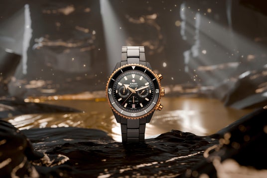ローズゴールドカラーのブレスレットには、ポリッシュ仕上げのブラウンハイテクセラミックのミドルリンクをあしらい、贅沢な印象をまとう一方で、ジュエリーのようなサイズ感が均整の取れた美しさを際立たせています。