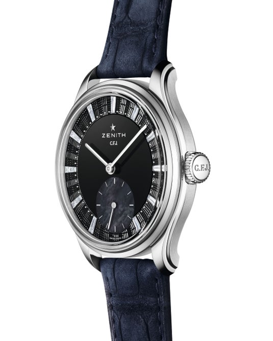 このアプローチは、文字盤でも注意深く探究されています。中央のディスクに使用したブラックオニキスは、ポリッシュ仕上げにより、表面はまるで液体のような質感を湛えています。6時位置に配した大型のスモールセコンドカウンターは、グレーのマザーオブパールを使用し、モノクロームの構成を乱すことなく、繊細な色味の変化を加えています。文字盤を囲むように、外周部を構成しているブリックパターンのギョーシェ模様は、ゼニス マニュファクチュールのファサードに着想を得たもの。そして、11ピースのバゲットカット ダイヤモンドのインデックスが、建築的な精度で文字盤にアクセントを加えています。直線的なダイヤモンドインデックスと細身のホワイトゴールド製の時・分針の組み合わせが抑制のきいた構成を生み出し、すべての要素がバランスとプロポーションを高めています。