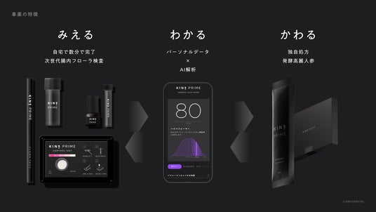 現代のビジネスパーソンは、多忙な日々の中でより高いパフォーマンスの実現を求めています。KINSは、創業以来蓄積してきた腸内フローラを含むマイクロバイオーム研究に基づいて、「みえる/わかる/かわる」をコンセプトに、次世代腸内フローラ検査とパーソナルデータ解析、独自処方(発酵高麗人参やプロバイオティクス等)を組み合わせ、体験・検査・介入を一体化した多忙なビジネスパーソン向けのヘルステックブランドであるKINS PRIMEを立ち上げました。