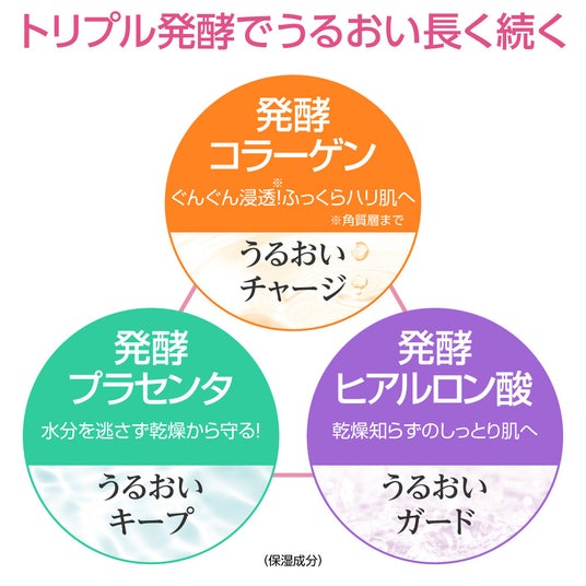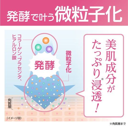 発酵させた美肌3成分コラーゲン・ヒアルロン酸・プラセンタを配合。発酵によって美肌成分が微粒子化され、角質層への浸透力がアップ。