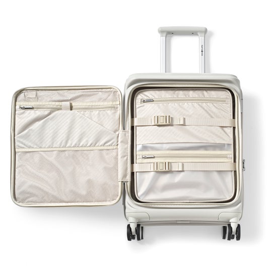パラリュクスの最大の特徴は、サムソナイトならではの革新的なデュアルアクセス構造にあります。中央のファスナーから開閉する従来のスタイルに加え、フロント部からもメイン収納部へ直接アクセス可能な設計で、限られたスペースでの荷物の出し入れや、素早く荷物を出し入れしたいときにもフレキシブルに対応できます。