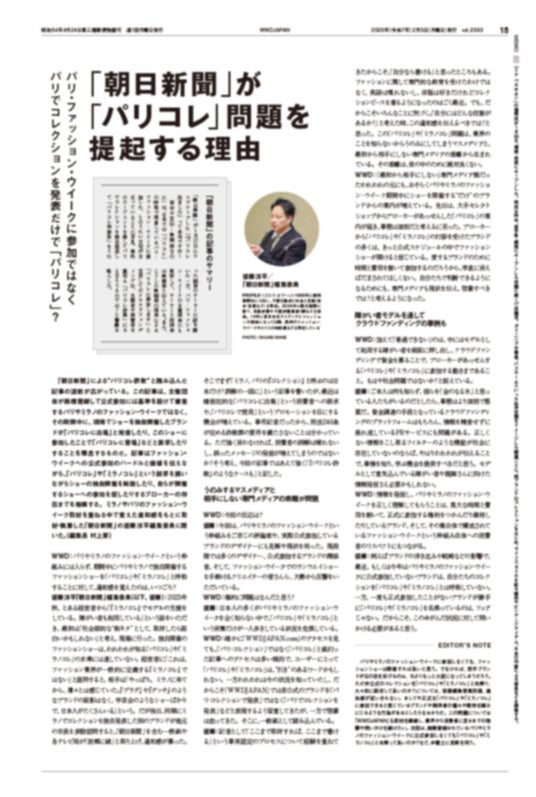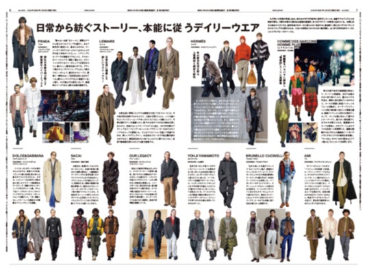 ほかにも、現地取材で感じたメンズの新たな傾向も紹介します。人間の本能に忠実な日常服と、色気を強調するスタイルの2つの新潮流は、どのような背景から生まれているのかを読み解きます。また、ファッション業界でも話題の「朝日新聞」による“パリコレ詐欺”の記事担当者に、記事制作の裏側を取材。記事化に至った背景などを聞きました。
