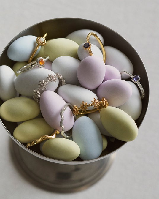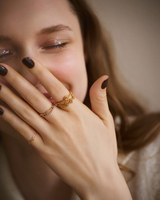 まるでポケットに手を入れた時のようにすっぽりと収まる、温かな着け心地のレイヤードリング。クラッカーから飛び出したカラーテープや、星形に模られたビーズたち。