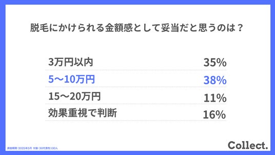 脱毛で妥当と思われる価格帯は「3万円以内」35%、「5~10万円」38%と、手の届きやすい価格帯に回答が集中。費用と効果のバランスがポイントとなるようです。