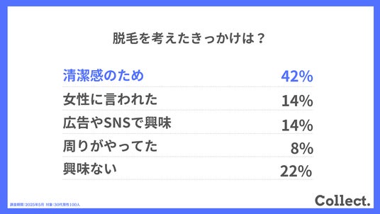 脱毛を考えた主なきっかけは「清潔感を保ちたい」という理由が最多の42%。「女性に言われた」「広告やSNSで興味を持った」という声もあり、周囲の影響が大きいようです。