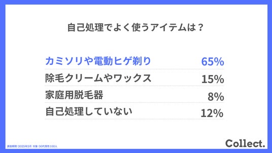 最も多かったのは「カミソリや電動ヒゲ剃り」で65%。手軽な自己処理が主流ですが、「除毛クリーム」「家庭用脱毛器」なども一定の支持を集めました。自分に合った処理方法を模索している人が多いようです。