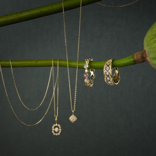 様々なチェーン使いのネックレスも登場。パーツ使いや組み合わせを楽しんだり、素材や長さも自由に楽しめるというバリエーションの豊かさが、”重ね着け”というスタイリングを提案しているアガットの真骨頂とも言える。