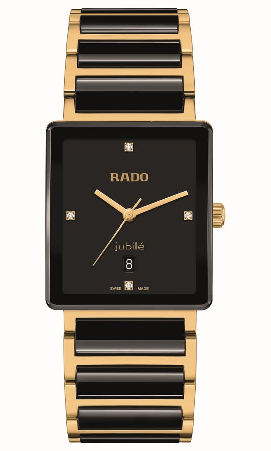 ブラック、イエローゴールドプリントのRadoおよびJubileのロゴ
