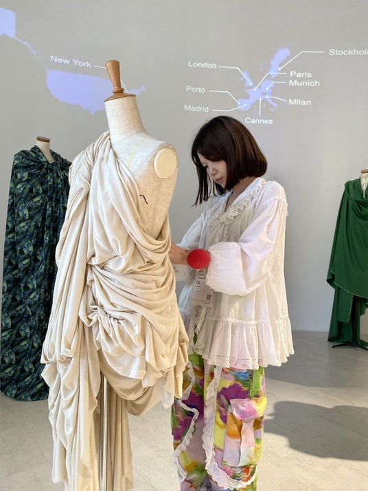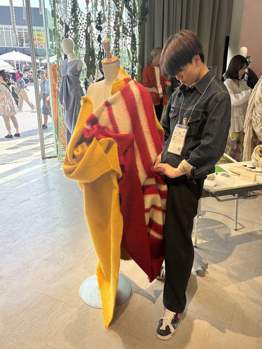 デザイナーおよびファッション人材を育成する大阪文化服装学院(以下OIF、学校法人ミクニ学園 理事長:豊田晃敏 所在地:大阪市淀川区三国本町)は、6月12日(木)~15日(日)「大阪・関西万博」ポルトガルパビリオン内のイベントスペースにて開催されたライブ・インスタレーション企画「持続可能な素材によるドレーピング」に参加しました。