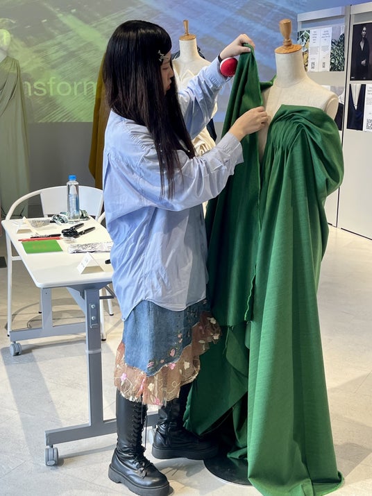 本企画は、ポルトガル繊維・服飾協会(以下ATP)主催の国際共同プロジェクトで、現地から持ち込まれたATPメンバー5社のサステナブル素材を用い、学生がドレーピング(立体裁断)技術により即興で衣服を構成するというライブ形式のイベントです。来場者の方々に作品が仕上がっていく過程を見ていただき、学生の創造性と、伝統とサステナビリティが息づくポルトガルのテキスタイルが織りなす、ライブならではの魅力を体感いただきました。