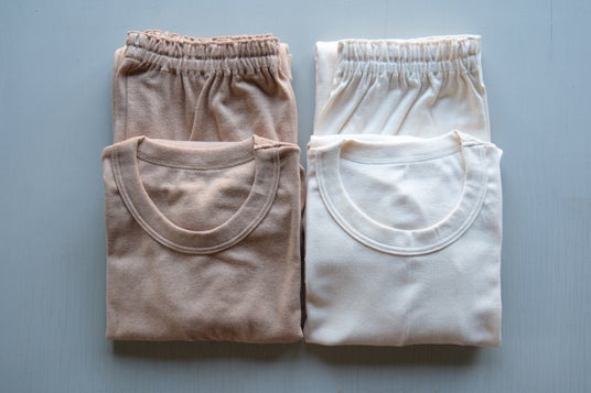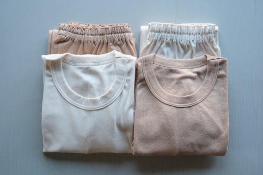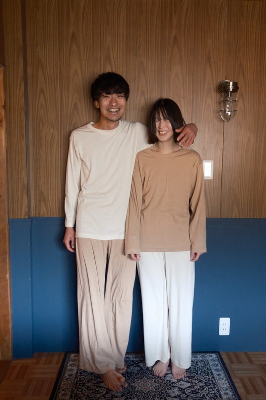 カラーは白と茶の2種類。どちらも無漂白・無染色、コットンそのものの天然の色味です。サイズ展開はユニセックスのSとM。トップスとボトムスはそれぞれ別売りで、カラー・サイズ共に自由な組み合わせを選ぶことができます。