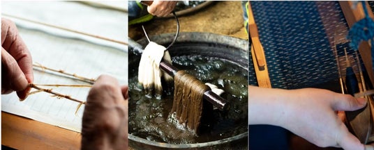 これらの3要素を細分化したおよそ30工程全てが国の重要無形文化財に指定されています。藍森山・森山絣工房では6代に渡り、これらの技術を守り継いできました。現存する久留米絣工房のなかでも数少ない天然染料と手織りを実現する工房です。