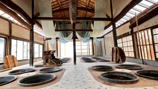 24の藍甕を備えた藍染工房。職人が糸を染める申請な場所。安全な工房に生まれ変わり一般の方向けの藍染体験ができるようになりました。
