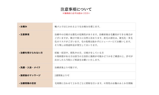 それぞれの施術メニューで使用する機器やその解説はもちろん、注意事項などの情報もわかりやすく掲載されているので、美容皮膚科に詳しくない方も、しっかりと施術メニューについて理解を深めた上で、予約するかどうかの判断が可能となります。
