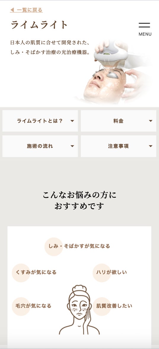 美容クリニックに通ったことがない方や美容医療に詳しくない方はもちろん、美容医療の経験が豊富で具体的な施術のイメージをお持ちの方にも必要な情報にスムーズにアクセスできるよう、それぞれの施術ページを再デザインいたしました。