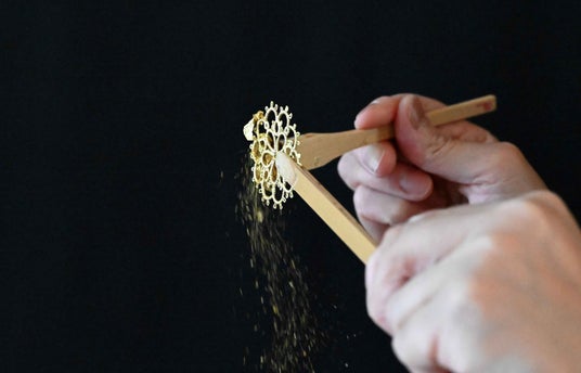 レースのモチーフに箔を貼り、余分な箔を落とす作業。箔を貼り、余分な箔を落とす作業を何度も繰り返す。