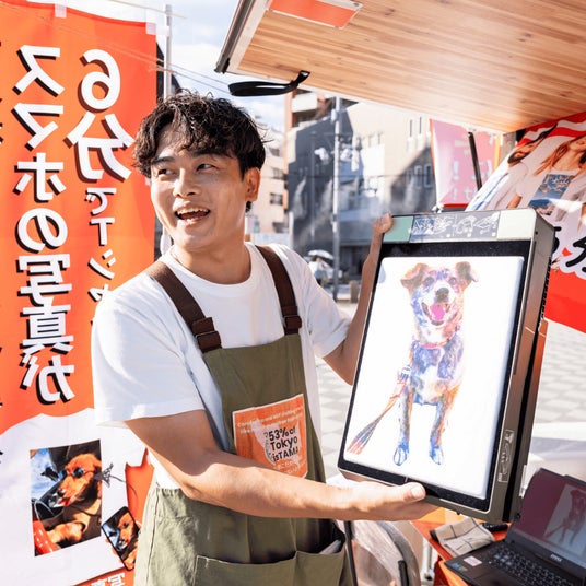 その特徴は何と言っても、スマホの写真から最短6分でオリジナルグッズが製作できる点。トラック内の75インチの巨大モニターで確認をしながら、背景の除去や文字入れなど、写真の加工まで行えるのも魅力だ。手掛けるのは合同会社AHA TOKYO(R) (代表: 水元和夫)。