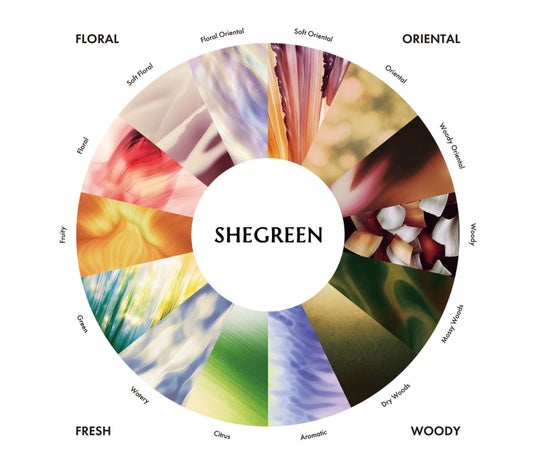 SHEGREENの 独自フレグランスホイールは、香りの構造(TOP/MIDDLE/BASE)と印象(EDGY/SENSUAL/NOBLE)を交差させた、“香りを視覚的に選べる”新しい体験設計ツールです。