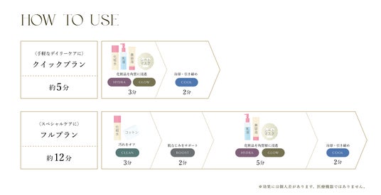 ■クイックプラン:「HYDORA」「GLOW」「COOL」の3ステップ。わずか約5分でケア。朝のお手入れやメイク前に。