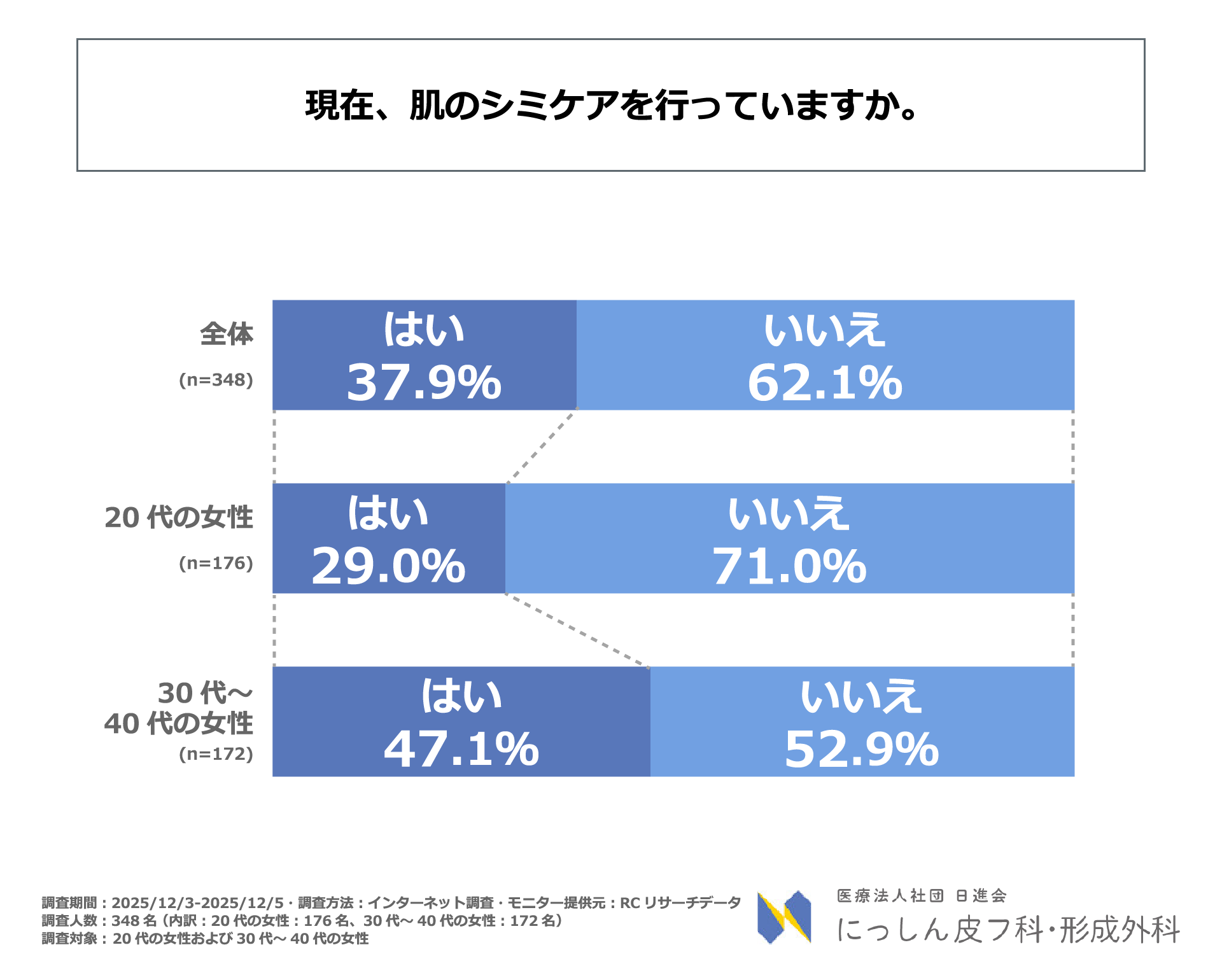 夏場は徹底される紫外線対策も、冬になると多くの女性が手を緩めてしまう傾向にあります。しかし冬は、夏のダメージが表面化し、乾燥で色素沈着するリスクがある季節です。 また、現在の肌状態は「冬のケア」だけでなく、「若い頃からどの程度ケアを継続してきたか」という蓄積の結果でもあります。そこで、医療法人社団 日進会 にっしん皮フ科・形成外科は、20代と30代~40代の女性を対象に、「肌のシミケアに関する世代別意識調査」を実施しました。